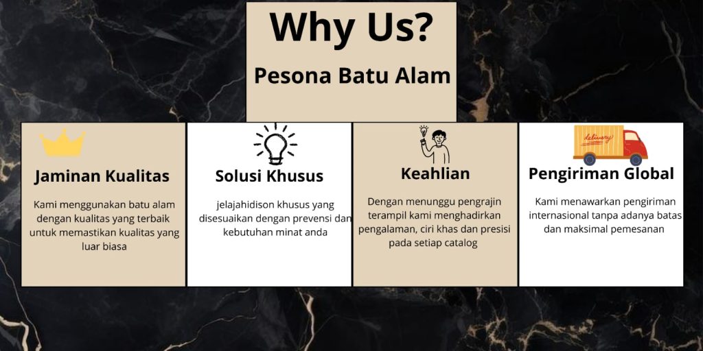 Kami berkomitmen menyediakan produk terbaik seperti Marmer, Granit, Andesit, Onyx, Batu Fosil, serta berbagai kerajinan seperti wastafel, pedestal, gentong, dispenser, wall cladding, mozaik, dan ornamen dekoratif lainnya.